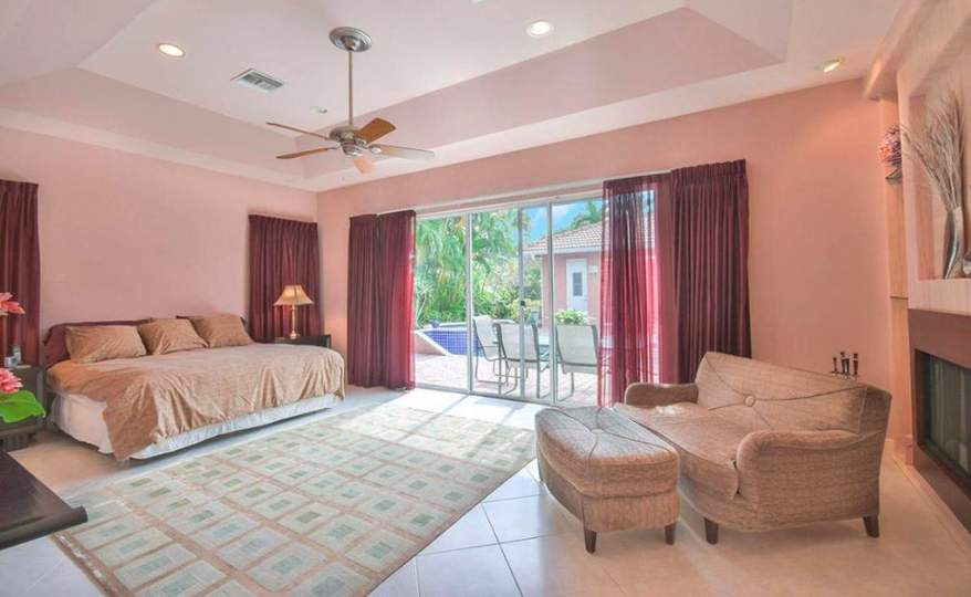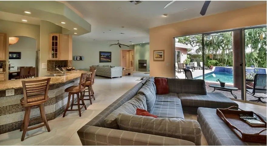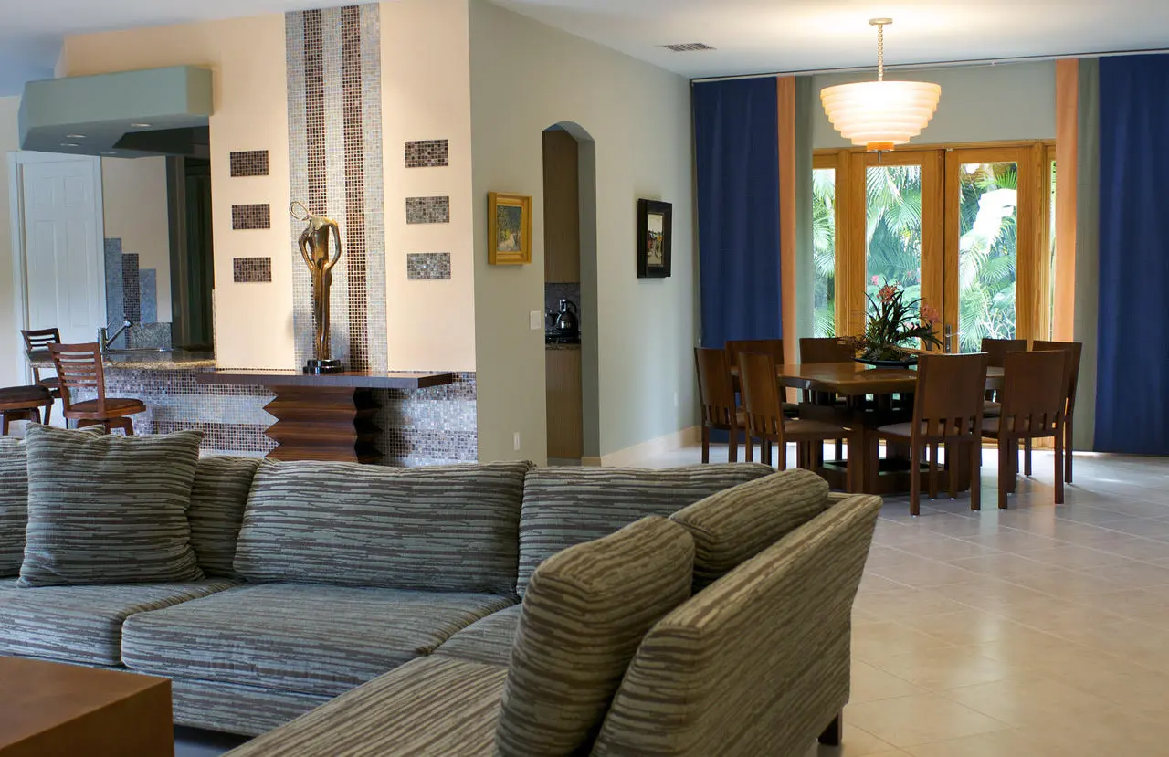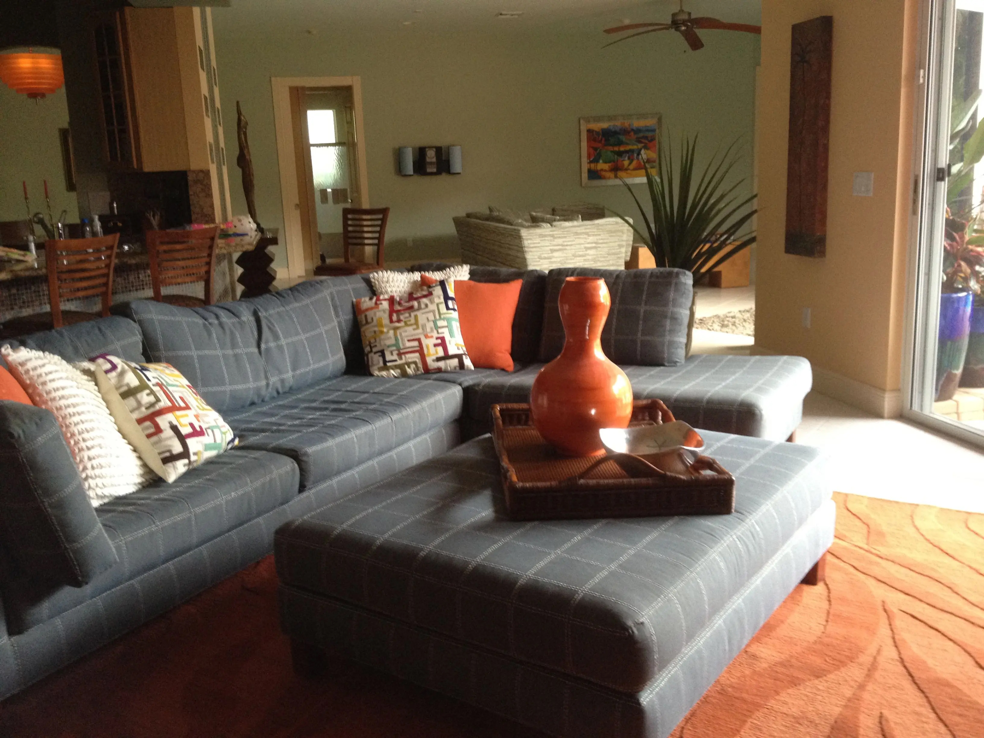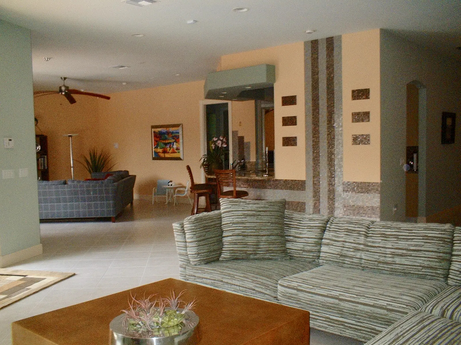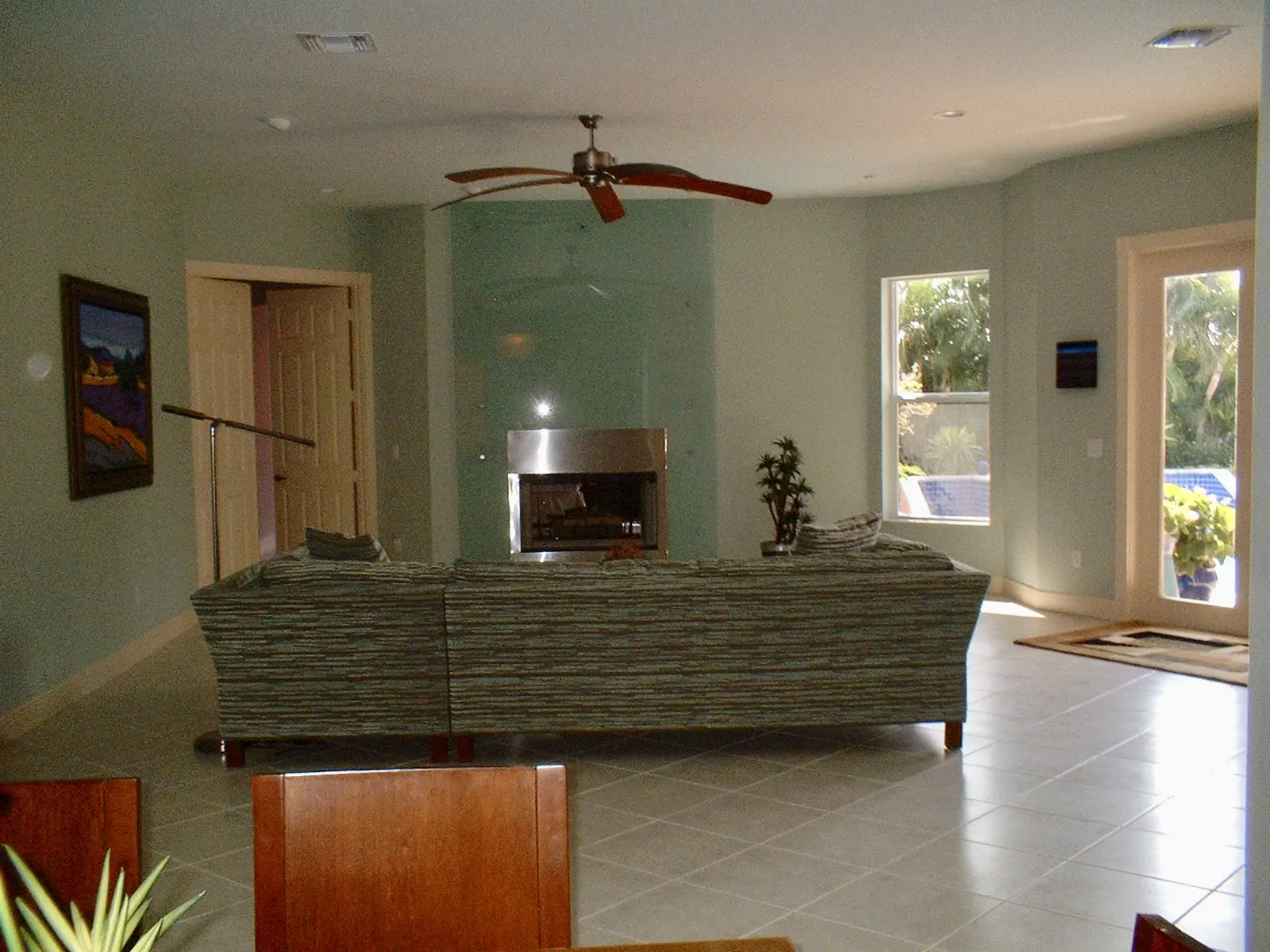 I designed this home 20 years ago. This was the first "Open Floor Plan’" that I’ve ever designed. I grew up with this style of home in Miami and loved it. These fantastic clients are from England and they wanted tropical color. They adored the South Florida lifestyle, so I kept very true to the feeling of this area. Soft tropical hues and earthy elements. This Donghia fabric started the whole design - opulent and livable! Sea glass and charcoal fluid vertical stripe was my inspiration. I railroaded it on this RMI custom designed sofa so the colors would just flow nice and easy throughout the room. Each room had custom everything. We built this peekaboo fireplace and we surrounded it with sandblasted glass and chrome bullets on one side and a rustic burgundy frame on the master suite side. We created a lot of stunning tropical trompe-l’oeil finishes throughout the home. We even designed the exterior and landscaped it with this pretty, curvy walkway around their home. This property sparkled and the family was delighted!