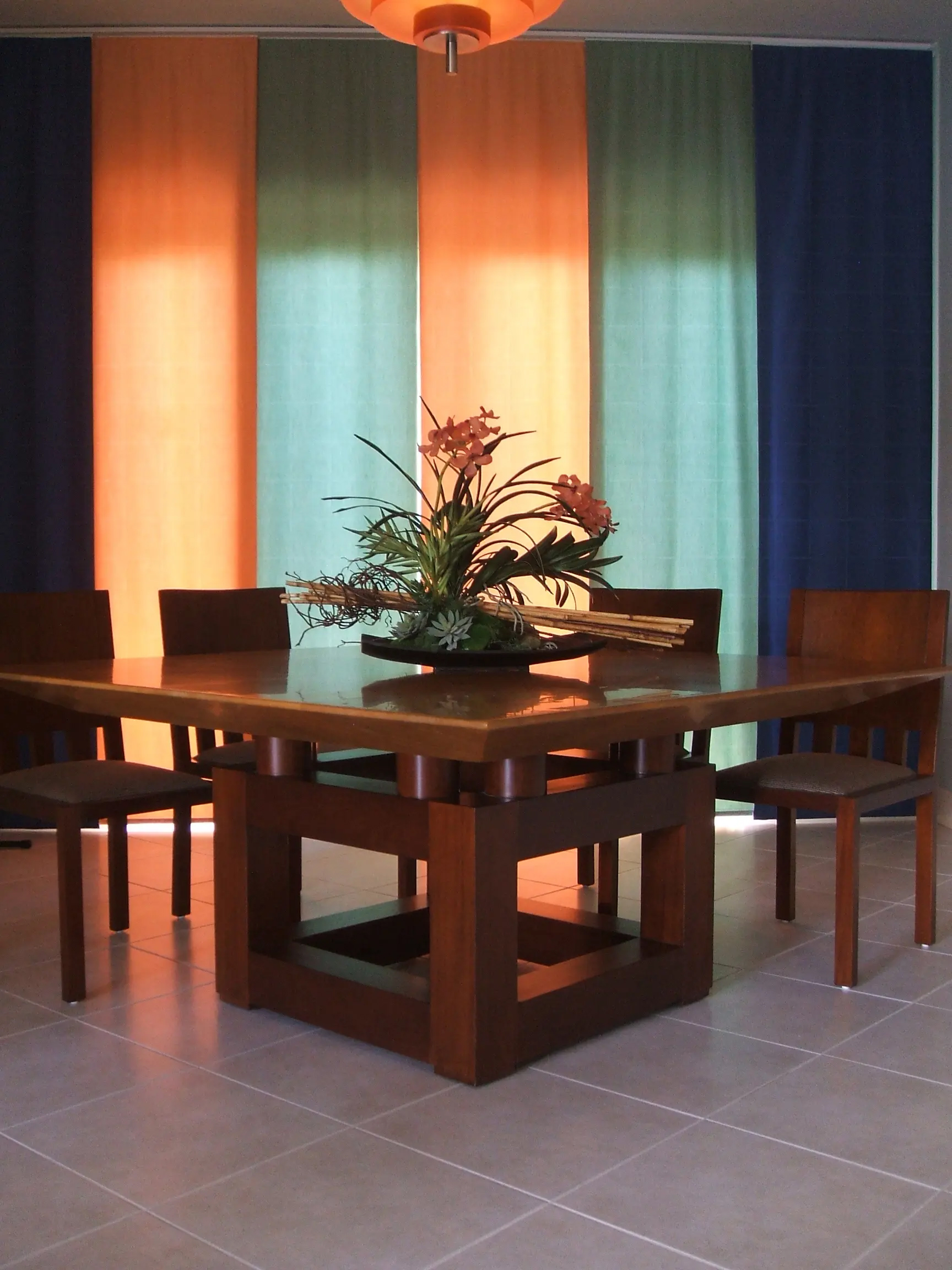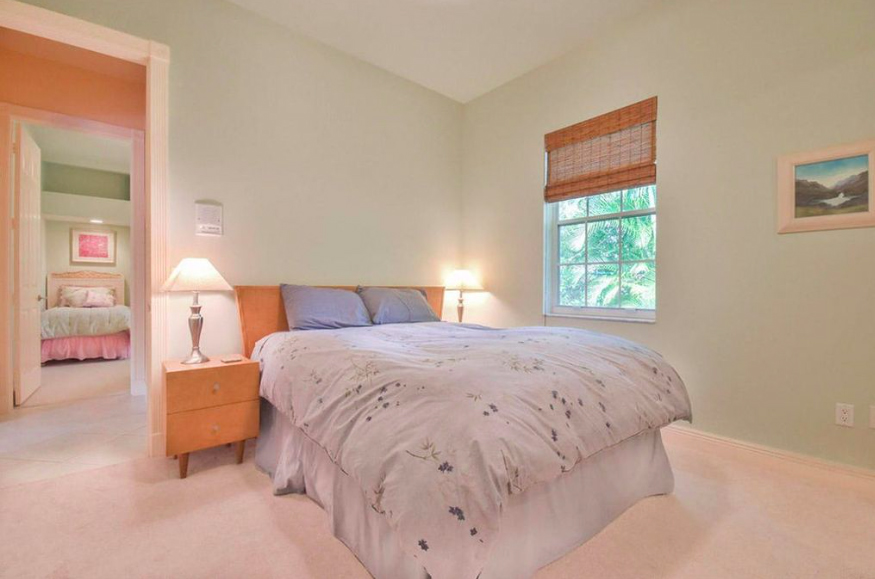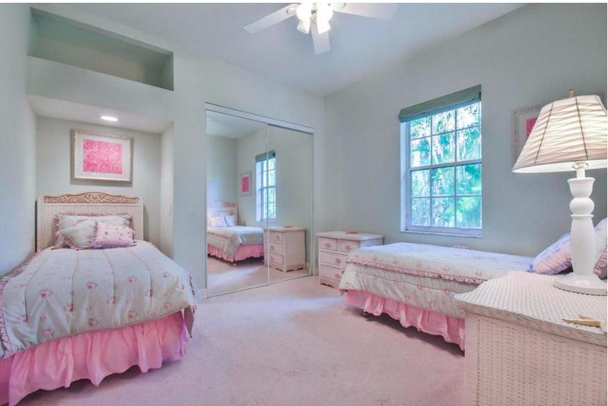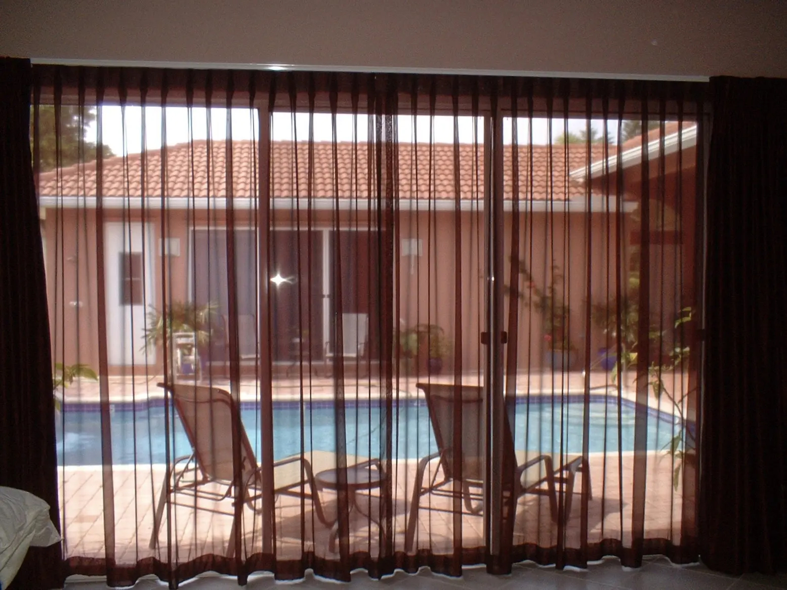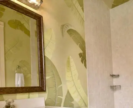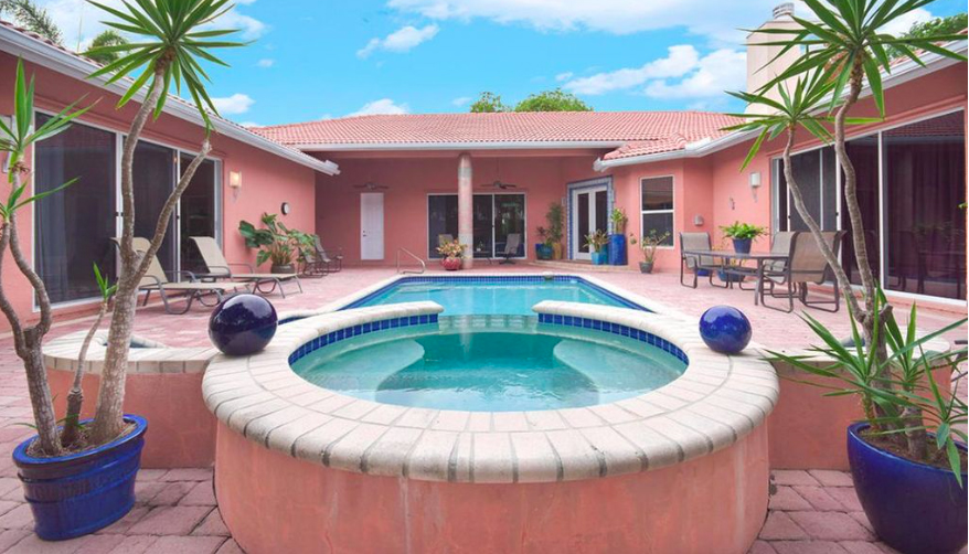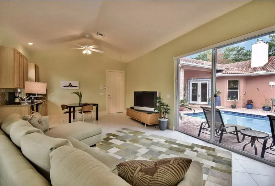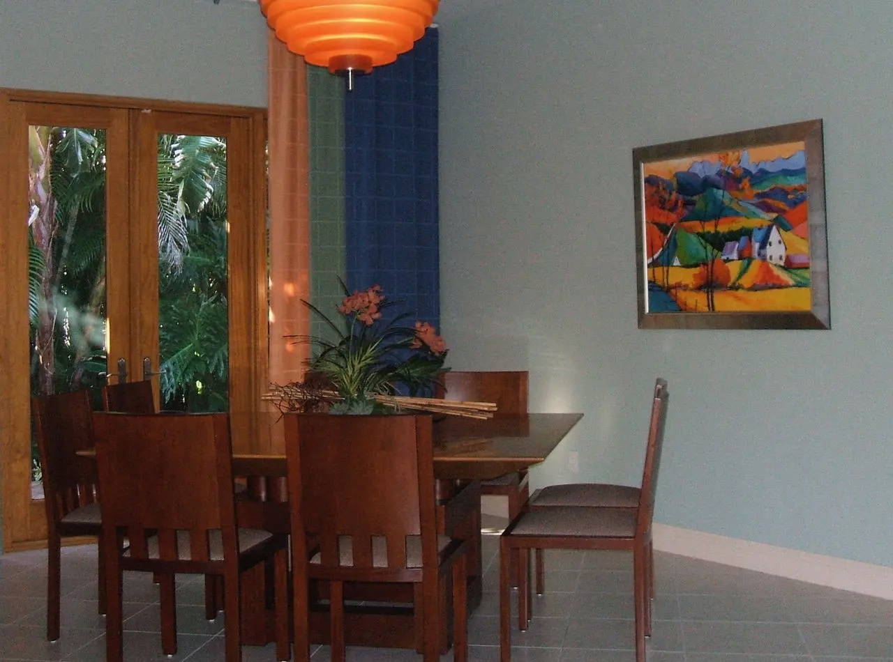 I designed this home 20 years ago. This was the first "Open Floor Plan’" that I’ve ever designed. I grew up with this style of home in Miami and loved it. These fantastic clients are from England and they wanted tropical color. They adored the South Florida lifestyle, so I kept very true to the feeling of this area. Soft tropical hues and earthy elements. This Donghia fabric started the whole design - opulent and livable! Sea glass and charcoal fluid vertical stripe was my inspiration. I railroaded it on this RMI custom designed sofa so the colors would just flow nice and easy throughout the room. Each room had custom everything. We built this peekaboo fireplace and we surrounded it with sandblasted glass and chrome bullets on one side and a rustic burgundy frame on the master suite side. We created a lot of stunning tropical trompe-l’oeil finishes throughout the home. We even designed the exterior and landscaped it with this pretty, curvy walkway around their home. This property sparkled and the family was delighted!