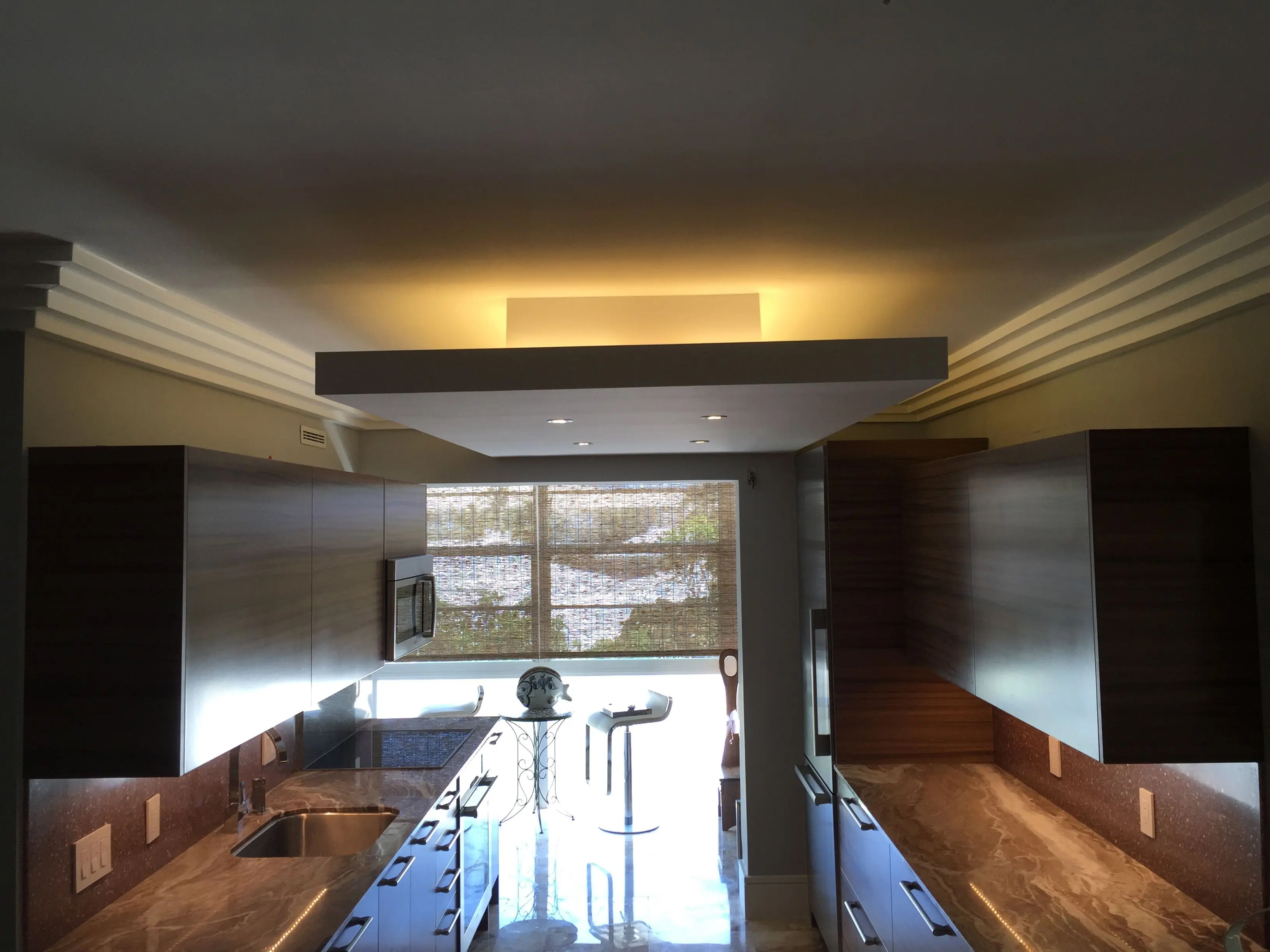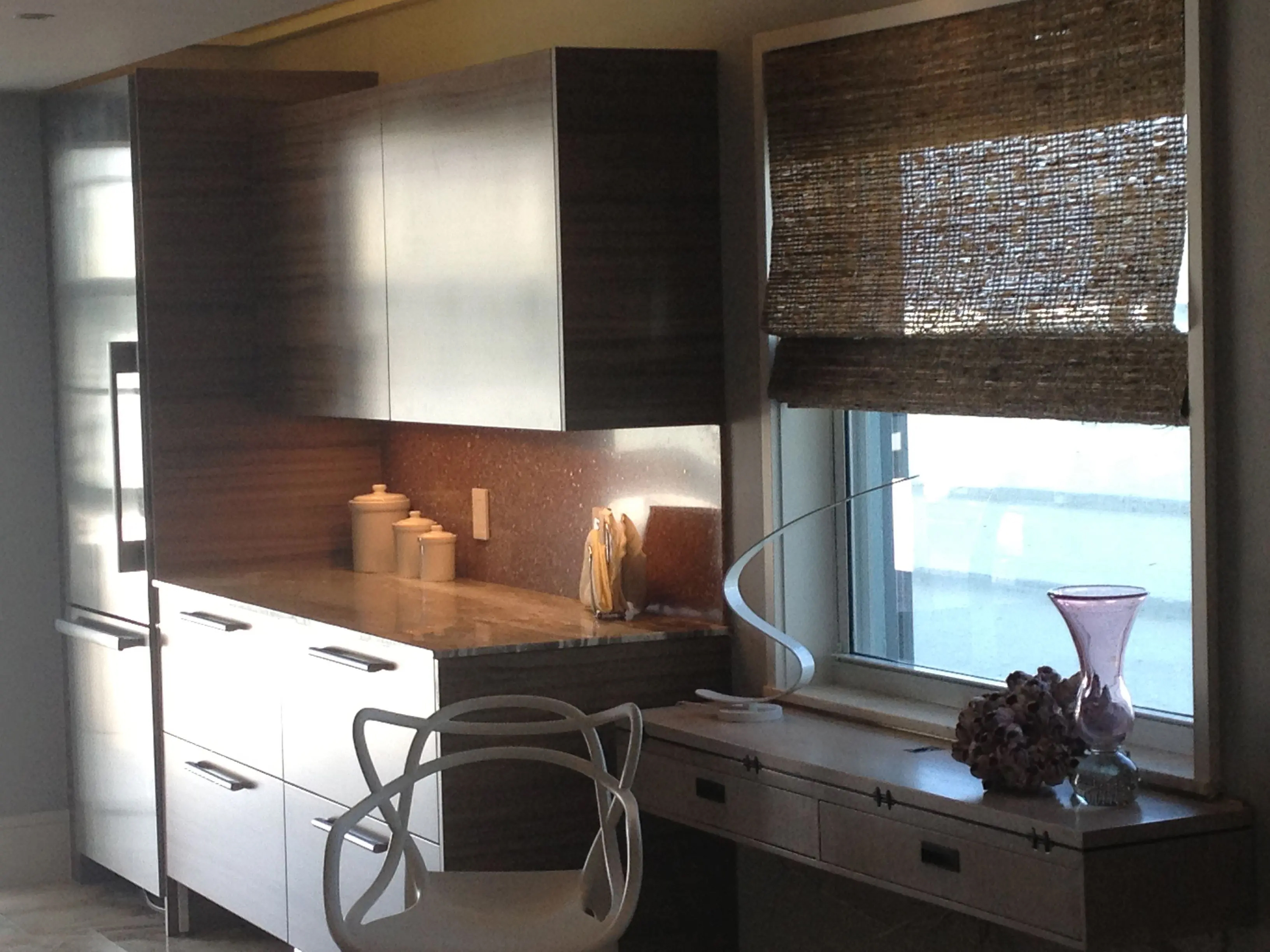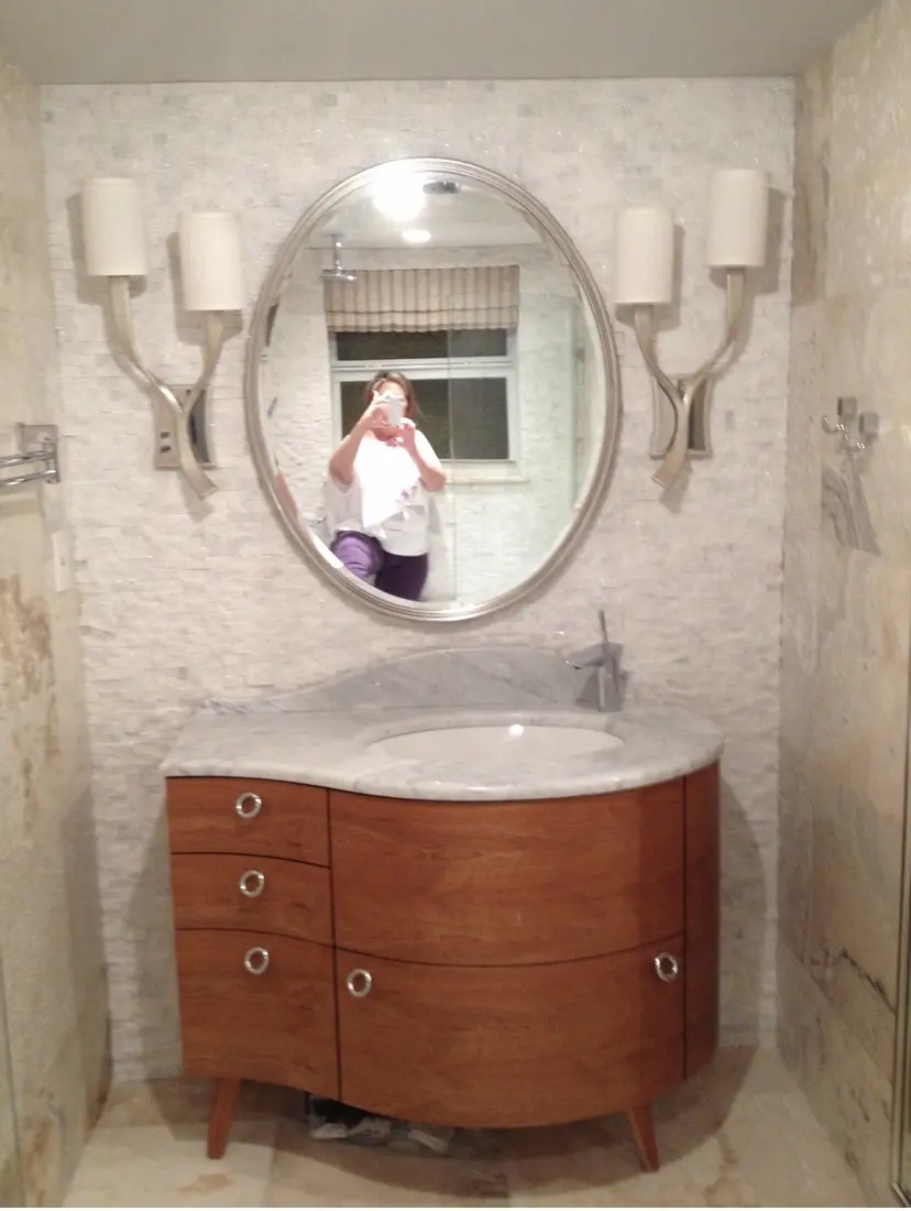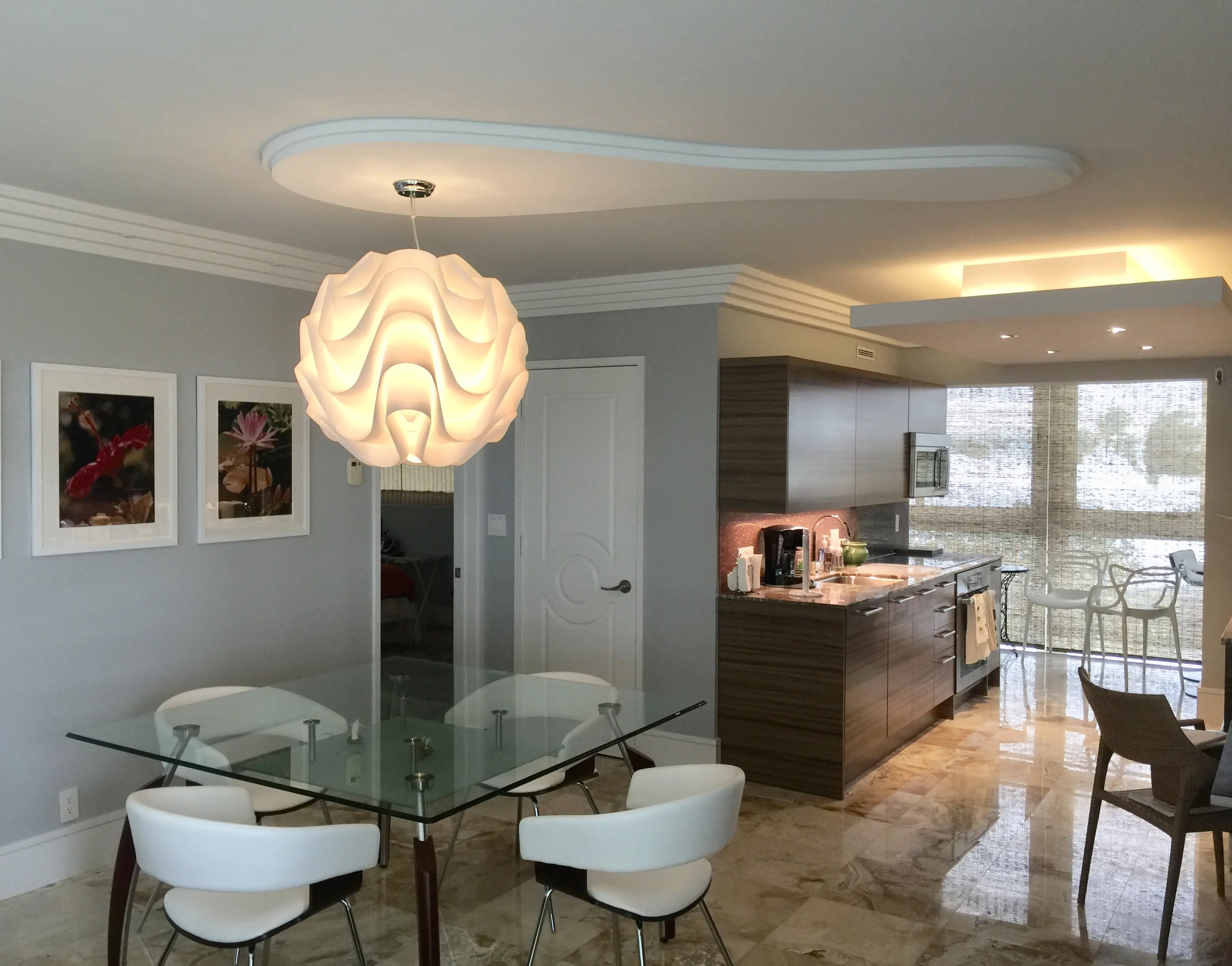 I designed this pied-a-terre in 2011 for this exquisite client. We moved walls and updated the plumbing, the electric and the HVAC before we even started the project. We expanded every room we could. Bigger closets and bigger bathrooms. Then we laid this pretty sandy, creamy marble all the way through this very special gem. An exquisite Downsview kitchen was installed with pretty pink mink cabinets. The stone we found for the counters matched the mink finish of the cabinets perfectly and the mink color Avonite for backsplash. Pink mink! We started with this stair step molding and then we put LED PUC lighting in the best step of the molding so the lighting would wash over her son's photographs perfectly. We used 3000 LED so it would have a nice warm glow for ambiance at night. Truly one of my favorite accessories are doors! We framed out every opening and put in gorgeous doors perfectly selected for each opeing and all new hurricane windows. Soft coastal hues throughout and beautiful original modern pieces. Perfect for this 1956 revival!