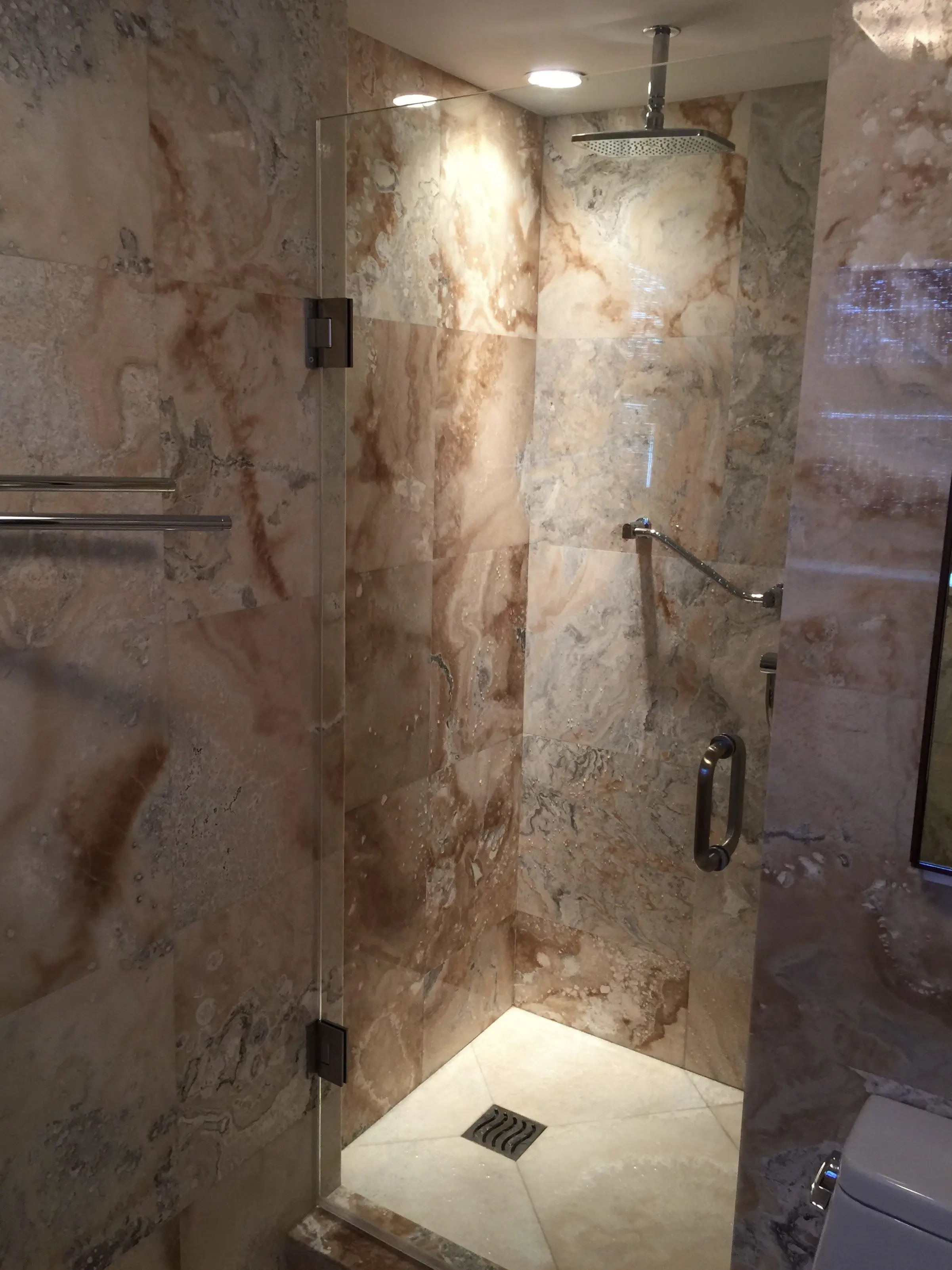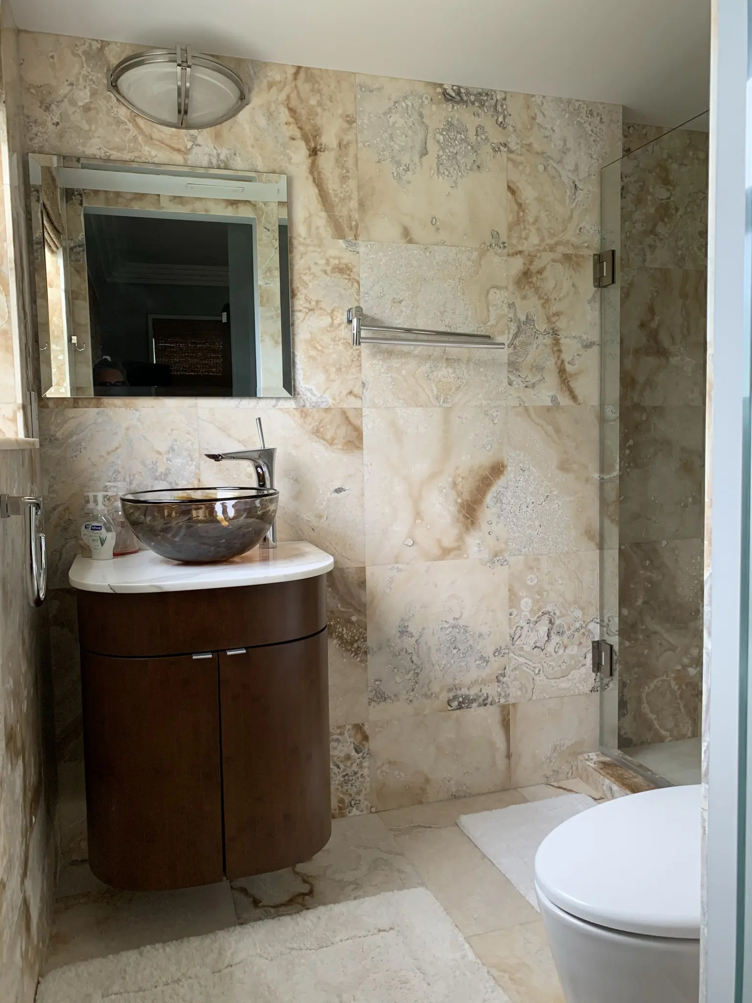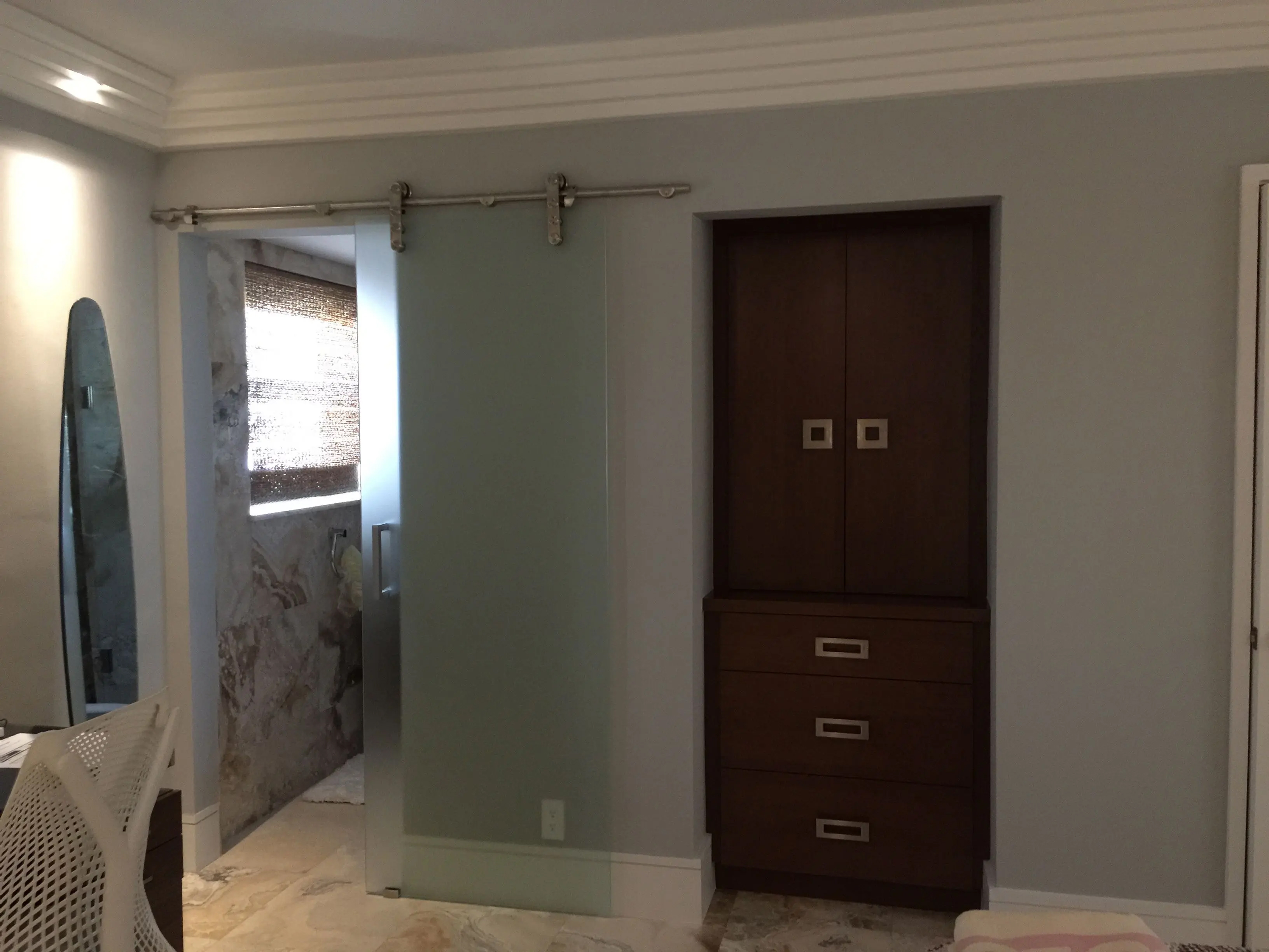 I designed this pied-a-terre in 2011 for this exquisite client. We moved walls and updated the plumbing, the electric and the HVAC before we even started the project. We expanded every room we could. Bigger closets and bigger bathrooms. Then we laid this pretty sandy, creamy marble all the way through this very special gem. An exquisite Downsview kitchen was installed with pretty pink mink cabinets. The stone we found for the counters matched the mink finish of the cabinets perfectly and the mink color Avonite for backsplash. Pink mink! We started with this stair step molding and then we put LED PUC lighting in the best step of the molding so the lighting would wash over her son's photographs perfectly. We used 3000 LED so it would have a nice warm glow for ambiance at night. Truly one of my favorite accessories are doors! We framed out every opening and put in gorgeous doors perfectly selected for each opeing and all new hurricane windows. Soft coastal hues throughout and beautiful original modern pieces. Perfect for this 1956 revival!