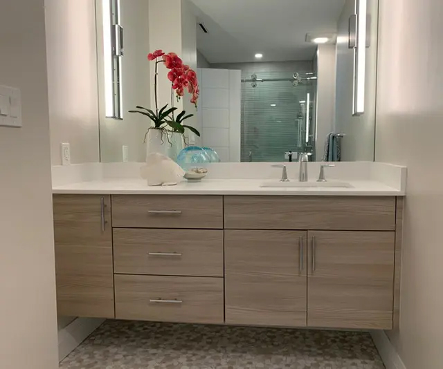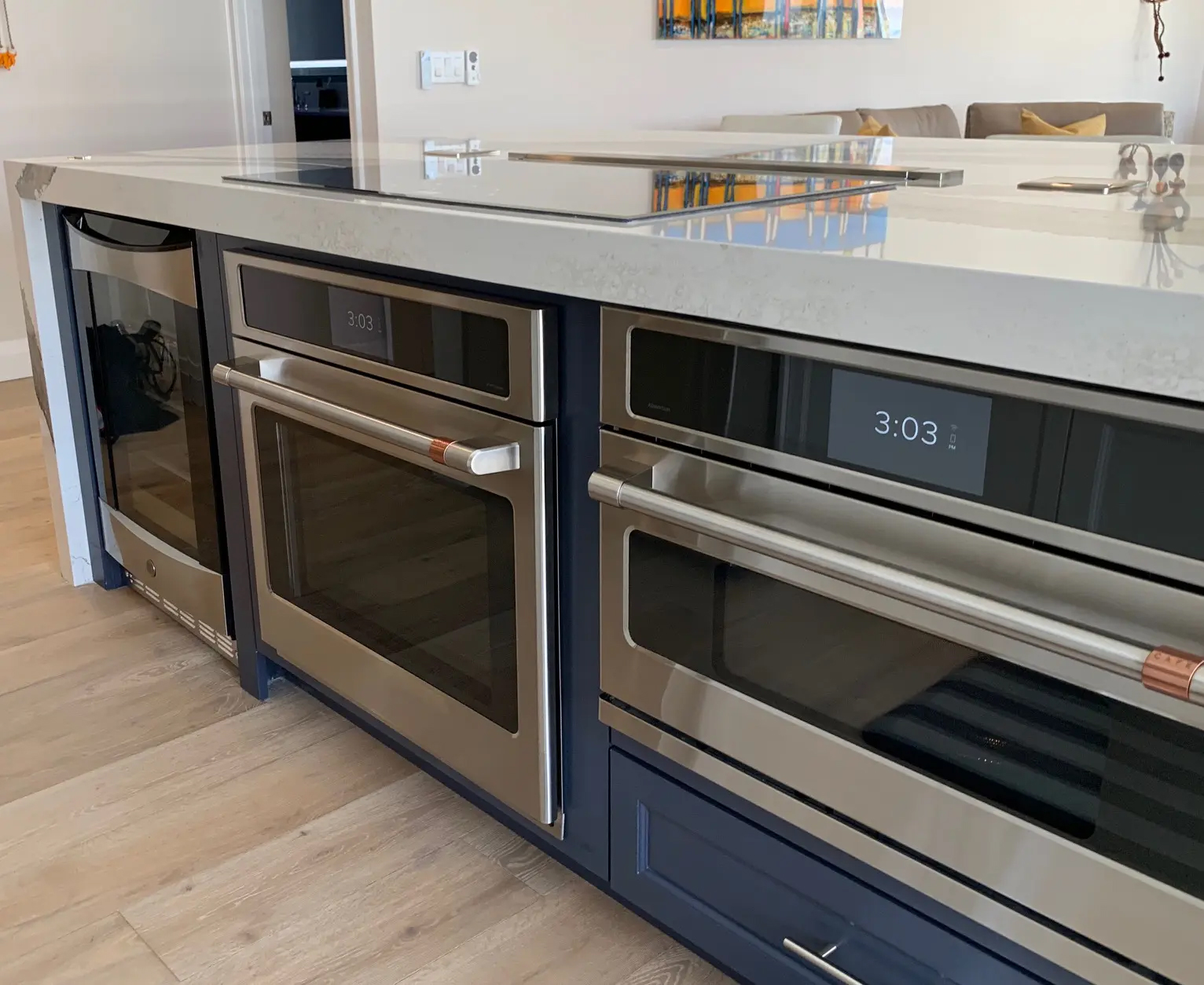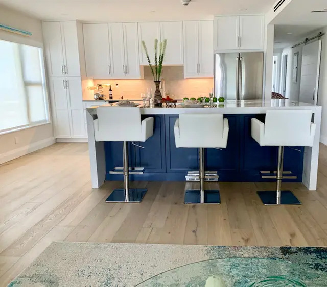 We took the kitchen walls down to open up the space and installed this gorgeous pecan wood floor throughout this gem. Then we built this fantastic waterfall kitchen, and added a lofty sectional with lots of wall space for her collection of desired art pieces.